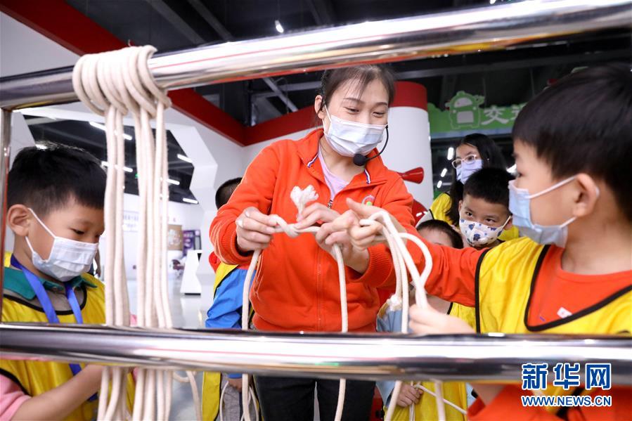 5月11日,在河北省石家莊公共安全體驗館,講解員為小朋友講解系逃生安全繩的方法。(新華社發 梁子棟/攝)