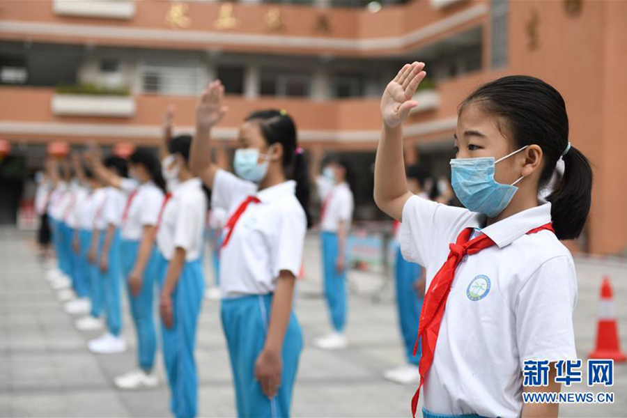 5月27日,在北京化工大學,參與演練的“返校學生”(中)進入教學樓時測量體溫。 當日,北京化工大學舉行學生返校復課疫情防控演練,為學生返校復課做準備。據介紹,從6月6日起,具備校園疫情防控條件的北京高校,可安排畢業年級學生自愿返校。(新華社記者 鞠煥宗/攝)