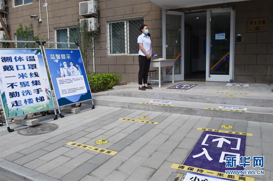 5月27日,在北京化工大學,學校工作人員在學生宿舍門口值守。(新華社記者 鞠煥宗/攝)
