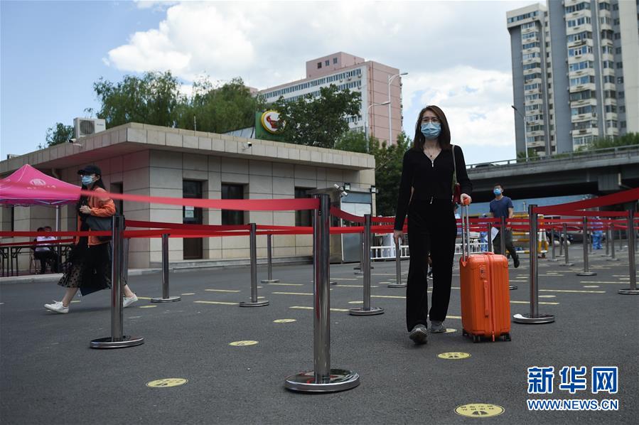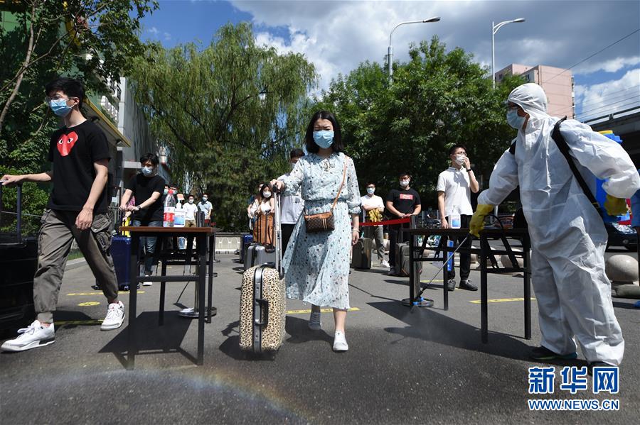5月27日,在北京化工大學門外,學校工作人員對“返校學生”進行鞋底和行李消毒。(新華社記者 鞠煥宗/攝)