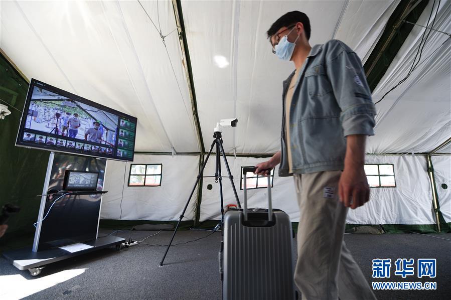 5月27日,在北京化工大學,參與演練的“返校學生”通過體溫測量區。(新華社記者 鞠煥宗/攝)