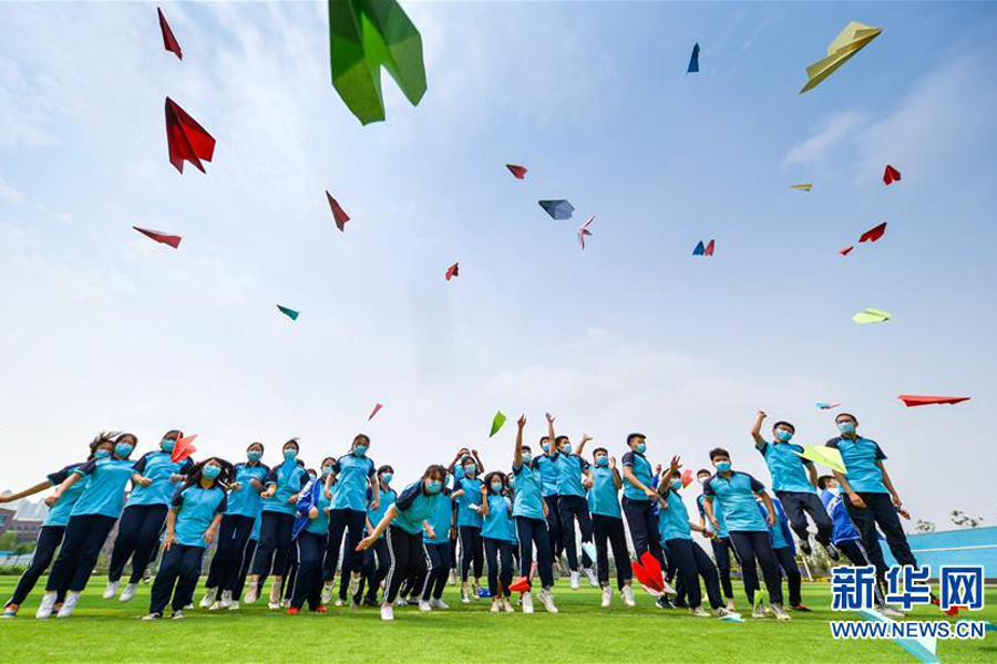 6月22日,河北省邯鄲市邯山區第一中學的高三學生將寫有自己夢想的紙飛機拋向空中。(新華社記者 王曉/攝)