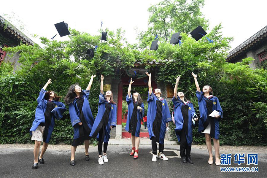7月2日, 在北京大學靜園三院門口,畢業生在拋碩士帽。(新華社記者 任超/攝)