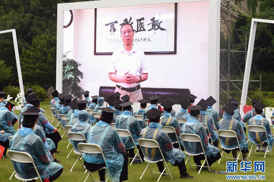 7月2日, 2020屆畢業生在畢業典禮上觀看校友代表、國家呼吸系統疾病臨床醫學研究中心主任鐘南山發言視頻。(新華社記者 任超/攝)