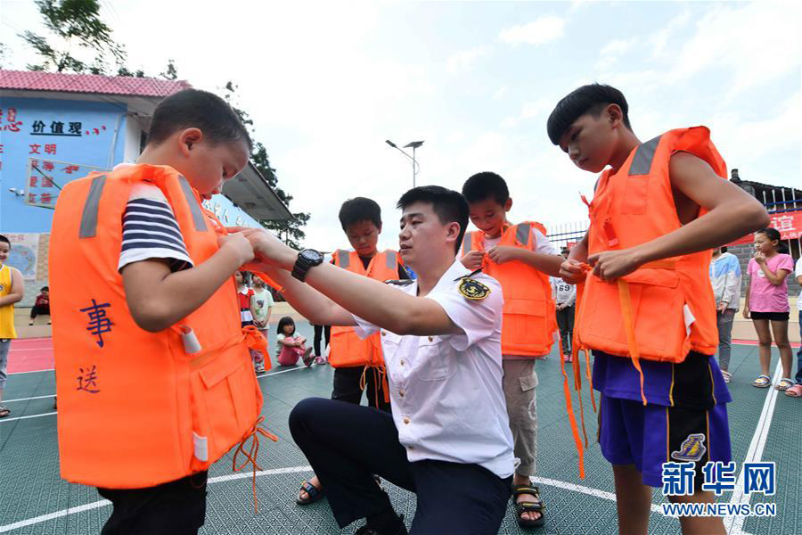 7月13日,在廣西融水苗族自治縣桿洞鄉黨鳩小學,融水海事處工作人員指導學生穿救生衣。當日,廣西柳州融水海事處在桿洞鄉黨鳩小學開展防溺水及水上交通安全知識教育活動,向學生們普及水上安全知識,并講解水上應急救援技能。(新華社記者 黃孝邦/攝)