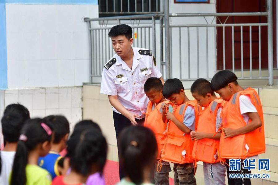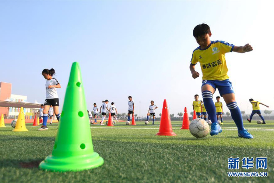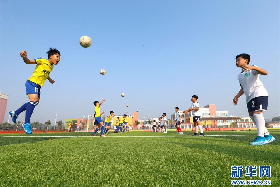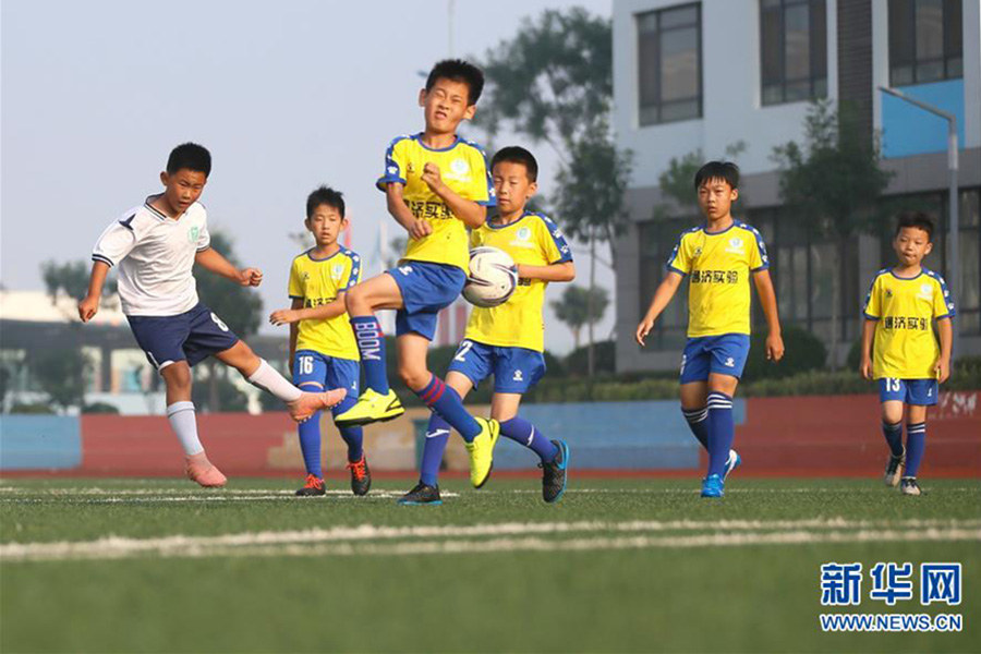 7月16日,青島通濟實驗學校的小球員在進行頭球訓練。(新華社發 梁孝鵬/攝)