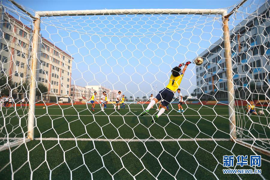7月16日,青島通濟實驗學校的小球員在足球場上進行比賽。(新華社發 梁孝鵬/攝)