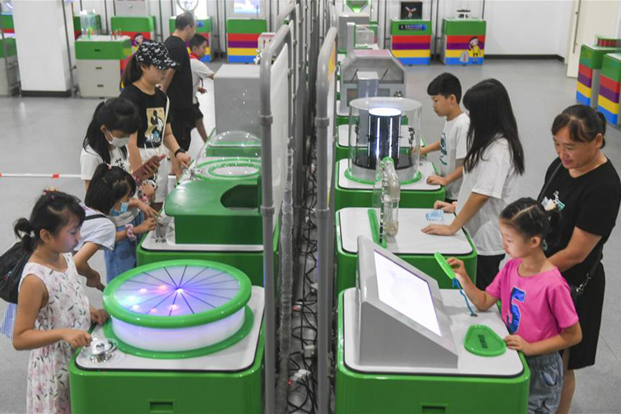 8月5日,孩子們在河北省唐山市豐南區一所少兒活動中心學習平衡單車。(新華社發 李秀清/攝)