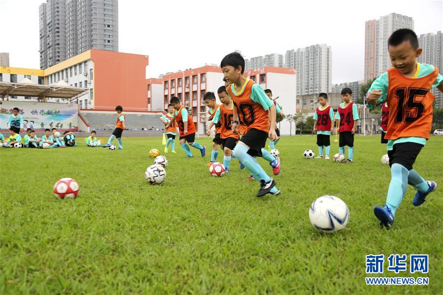 8月5日,參加暑期“快樂足球營”培訓班的小學員在江蘇省連云港市院前小學足球場訓練。 暑假期間,各種豐富多彩的課外活動讓孩子們度過充實的假期。(新華社發 王春/攝)