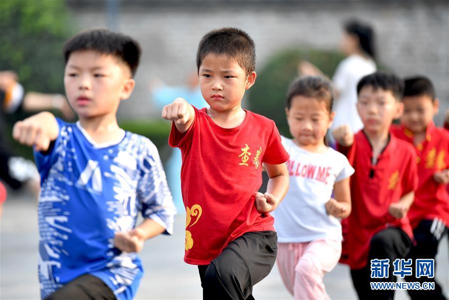 8月5日,孩子們在安徽省亳州市花戲樓廣場練習武術。(新華社發 劉勤利/攝)
