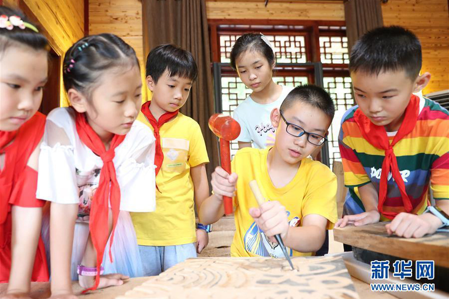 8月4日,孩子們在四川省華鎣市現代刻字藝術創作培訓基地學習現代刻字藝術。(新華社發 邱海鷹/攝)