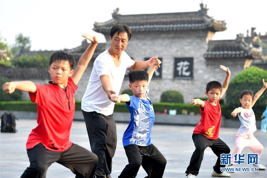 8月5日,在安徽省亳州市花戲樓廣場,孩子們在教練的指導下練習武術。(新華社發 劉勤利/攝)
