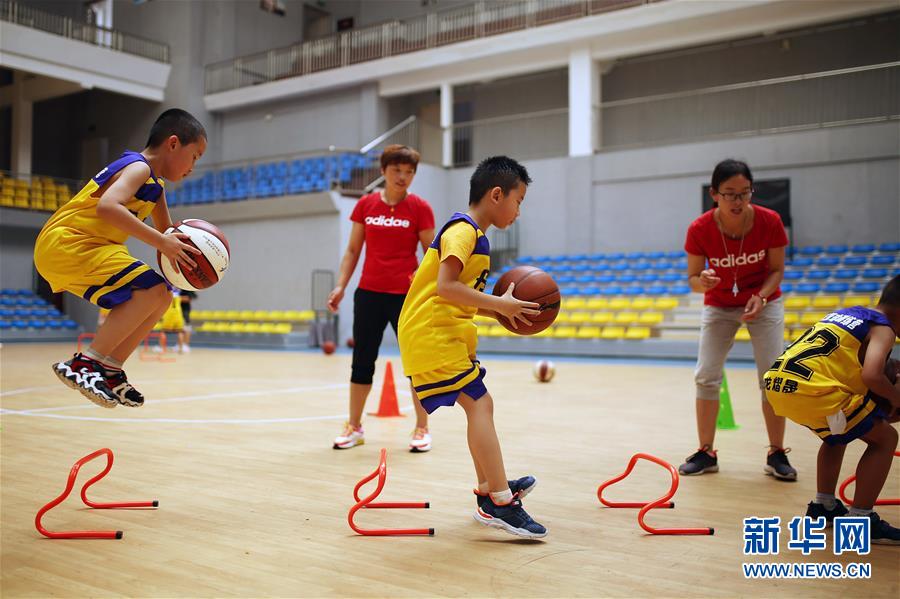 8月5日,在貴州省黔東南苗族侗族自治州丹寨縣的體育館內,參加暑期“少兒籃球訓練營”的小學員在教練的指導下練習帶球彈跳。(新華社發 黃曉海/攝)