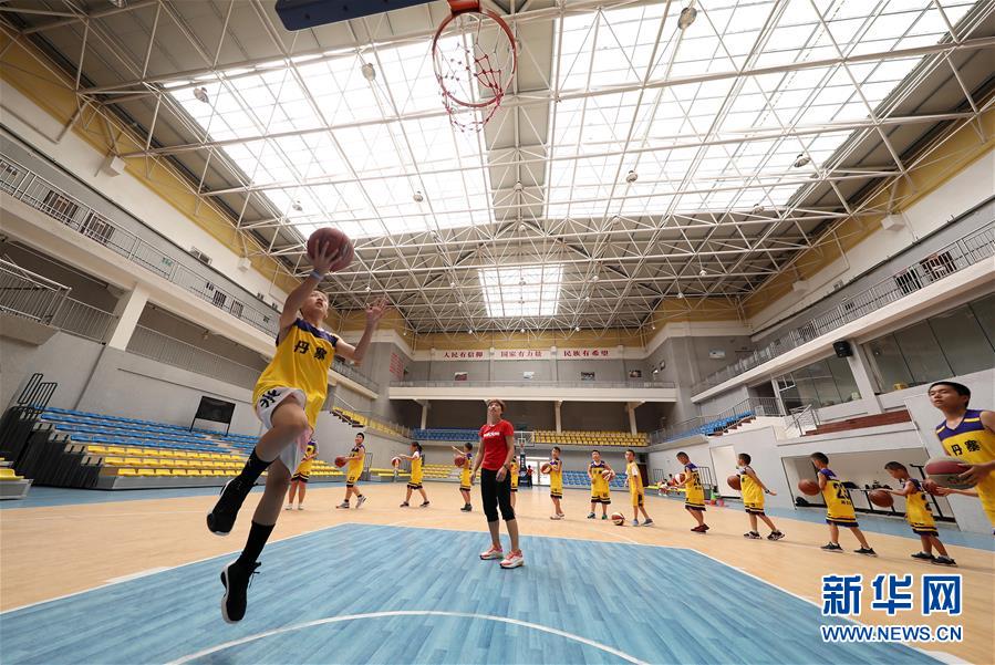 8月5日,在貴州省黔東南苗族侗族自治州丹寨縣的體育館內,參加暑期“少兒籃球訓練營”的小學員在教練的指導下練習上籃。(新華社發 黃曉海/攝)