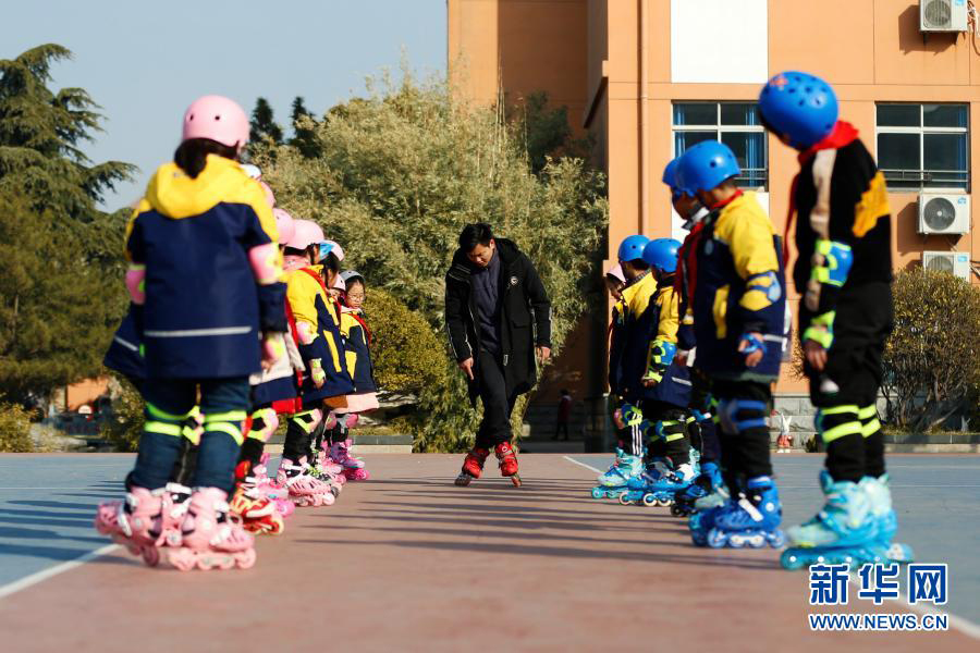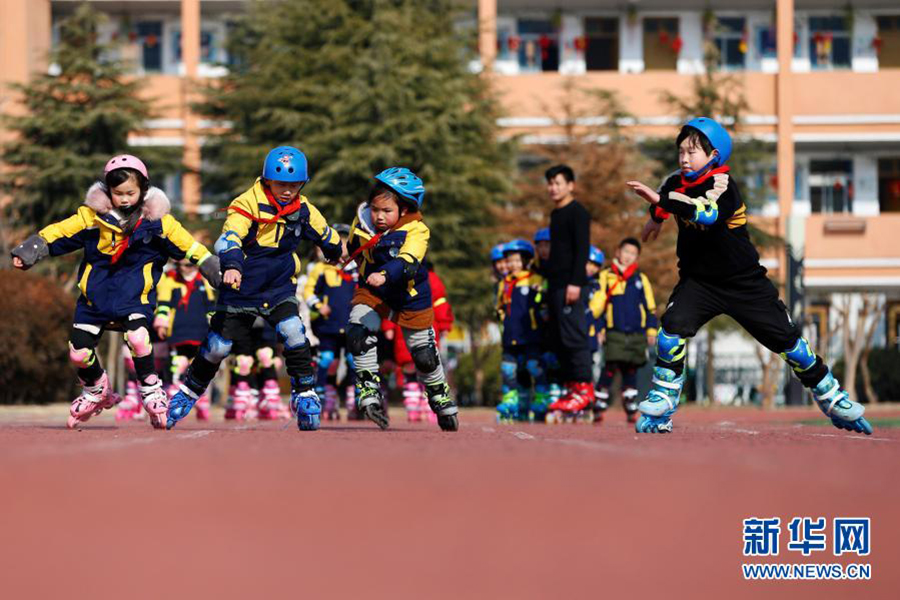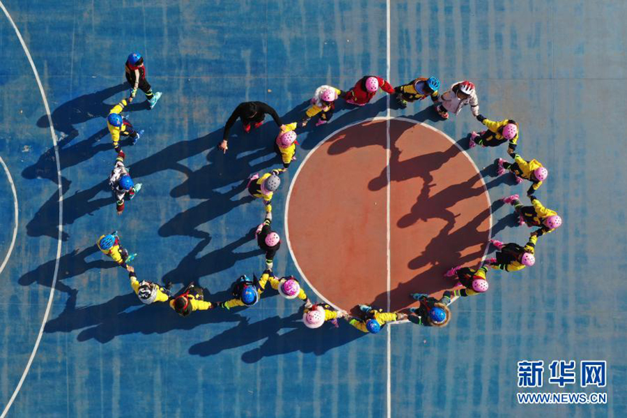 1月19日,江蘇泗洪育才實驗學校的輪滑隊員在校園內訓練。(新華社發 許昌亮/攝)