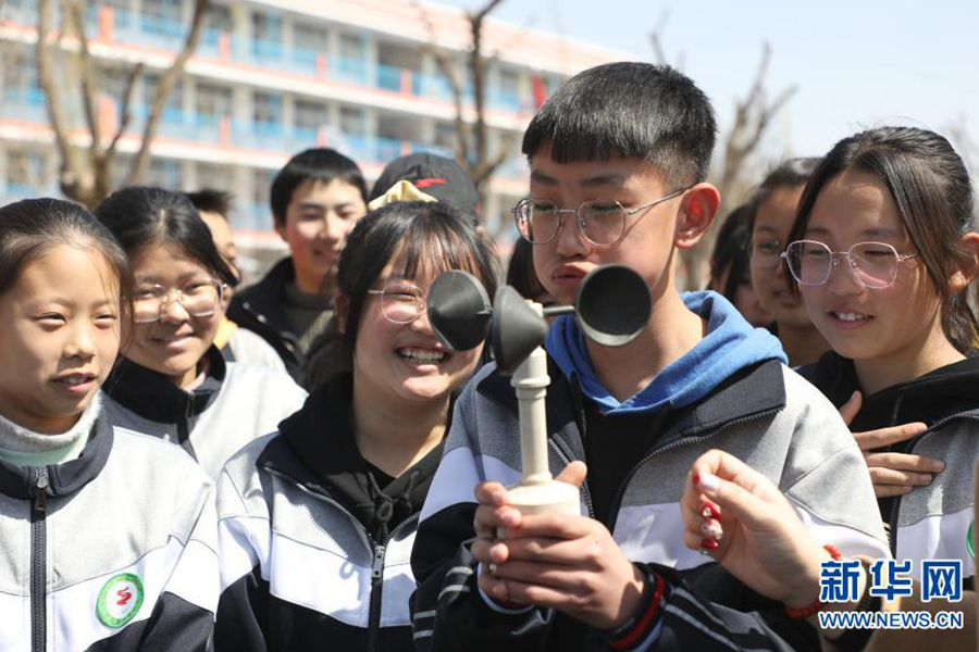 3月22日,山東省臨沂市沂南縣孫祖鎮中學一名學生在做風速實驗。(新華社發 杜昱葆/攝)