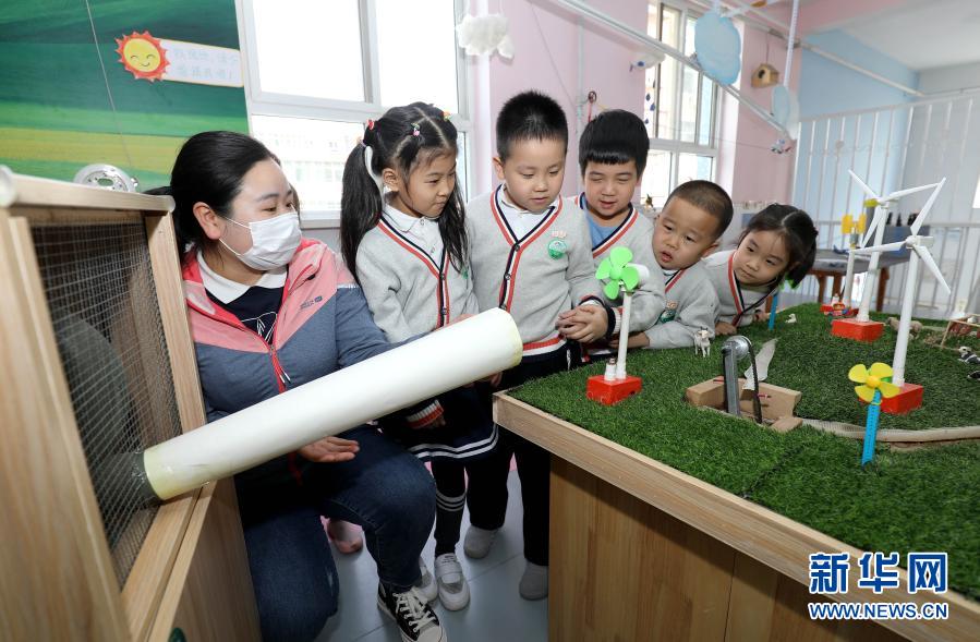 3月22日,在河北省石家莊市橋西區瑞特幼兒園,老師通過“風的超能力”科普實驗,讓孩子們感受風能的作用。(新華社發 梁子棟/攝)