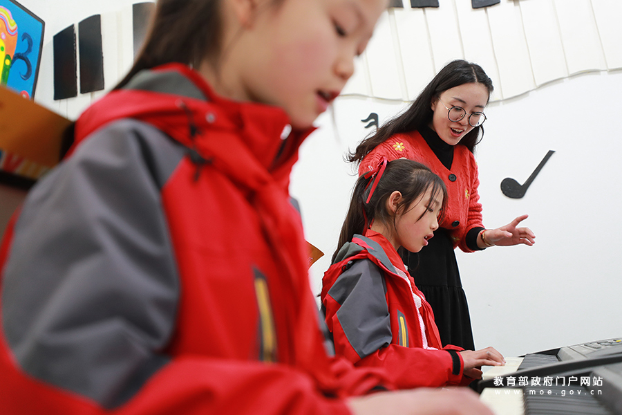 3月25日,貴州省遵義市播州區楓香鎮茍壩小學少年宮 “歡唱坊”,老師在輔導學生彈電子琴。(鄭啟彥 張學軍/攝)