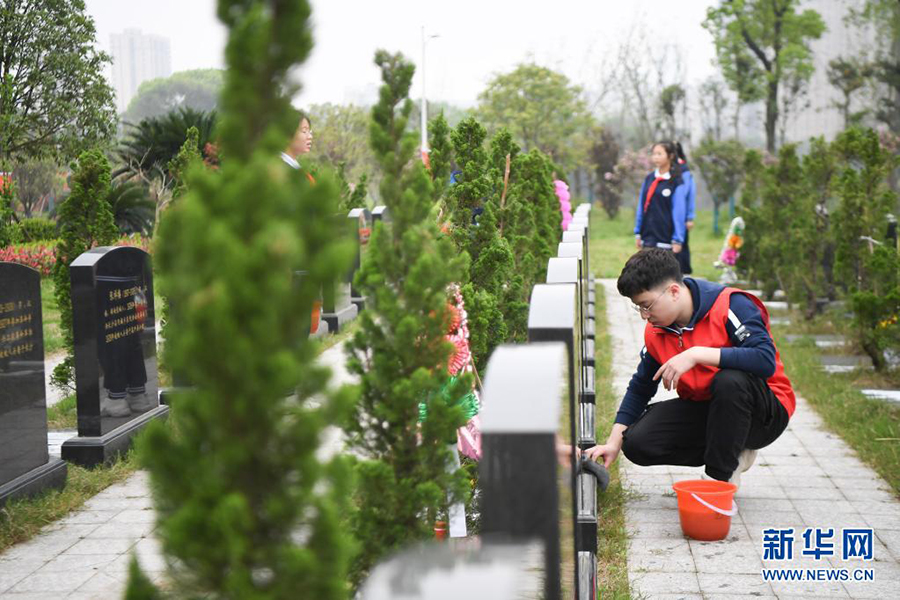 3月30日,志愿者在湖南革命陵園擦拭墓碑。(新華社記者 薛宇舸/攝)