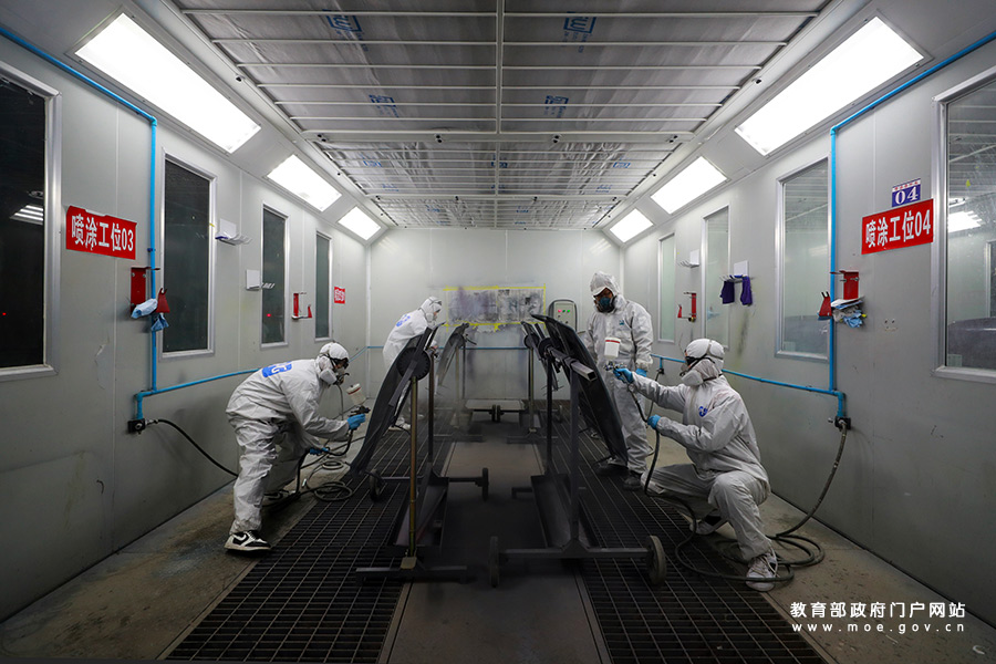 3月25日,貴州省遵義市播州區中等職業學校汽車產教融合實訓基地,汽車維修專業學生在進行噴漆實訓。(鄭啟彥 張學軍/攝)