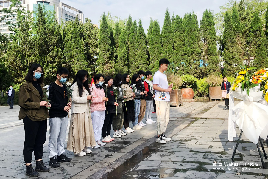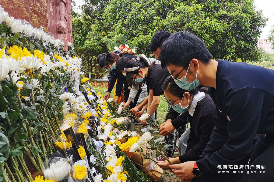 4月4日,在四川大學江安校區英烈碑前,四川大學華西口腔醫學院師生向革命先輩們敬獻鮮花、寄托哀思,紀念和緬懷英烈校友。(王馳/攝)