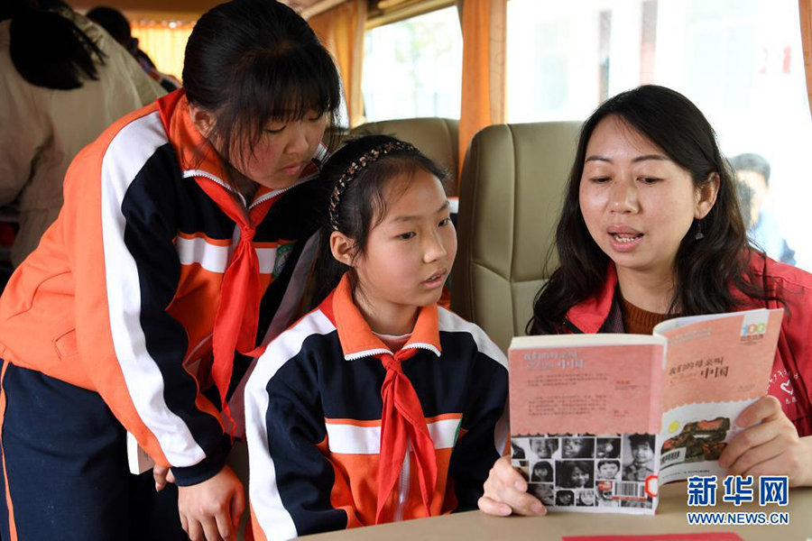 4月15日,志愿者向六安市金安區孫崗鎮許小河學校學生介紹紅色經典圖書。(新華社發 徐旻昊/攝)