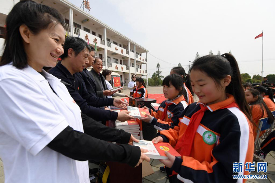 4月15日,志愿者向六安市金安區孫崗鎮許小河學校學生發放紅色經典圖書。(新華社發 徐旻昊/攝)
