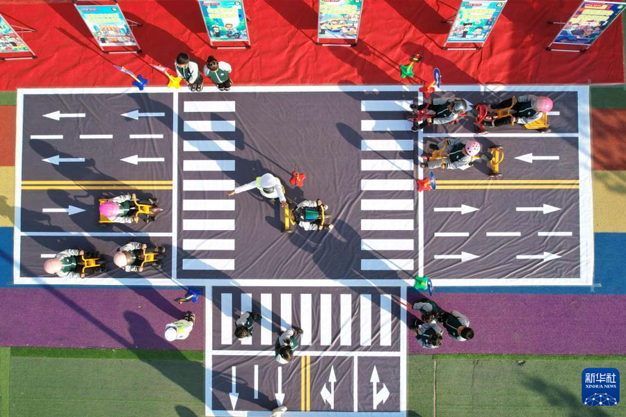 12月1日,在山東省臨沂市沂南縣雙堠鎮中心幼兒園,孩子們通過趣味游戲的方式學習交通知識(無人機照片)。(新華社發 王彥冰/攝)