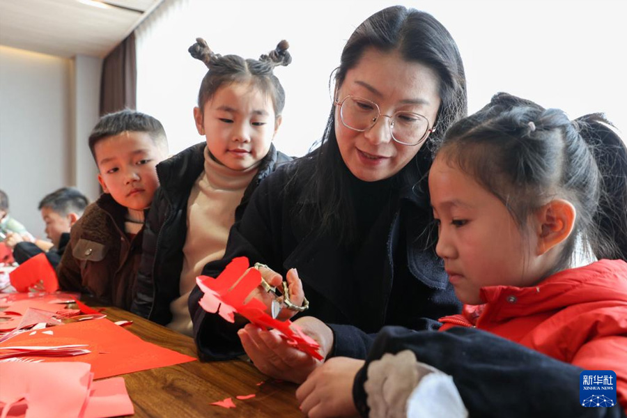 1月22日,浙江省湖州市德清縣洛舍鎮開展“傳承非遺迎新春”活動,孩子們在志愿者指導下學剪紙。(新華社發 姚海翔/攝)