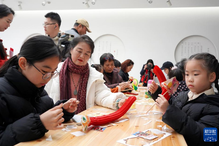 1月23日,在浙江省樂清市非物質文化遺產館舉行的“非遺文化迎新春”活動中,小朋友在制作手工蛇。(新華社發 蔡寬元/攝)