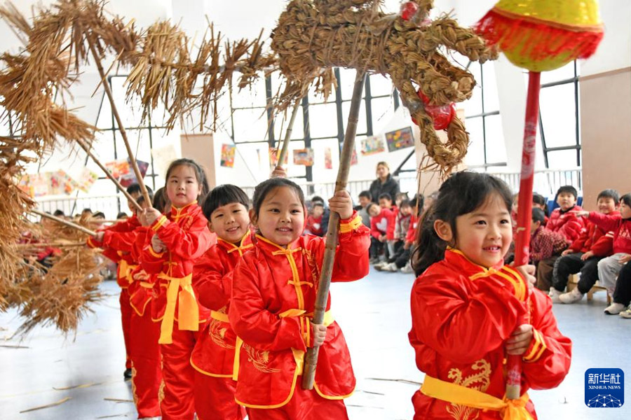2月27日,浙江省臺州市仙居縣下各鎮中心幼兒園的孩子在老師指導下進行“稻草龍”表演。(新華社發 王華斌/攝)