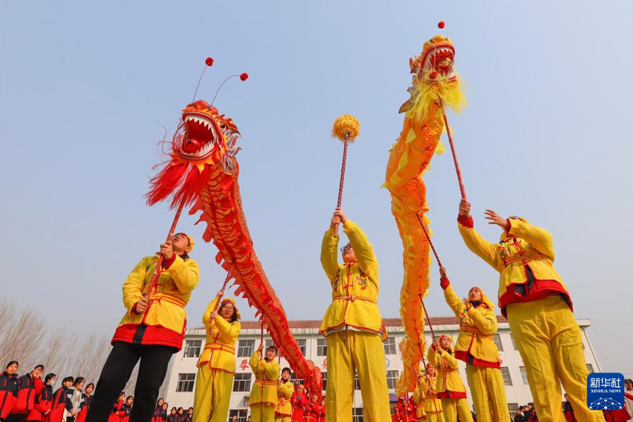 2月27日,河北省遵化市蘇家洼鎮下石河中學的學生在進行舞龍表演。(新華社發 劉滿倉/攝)