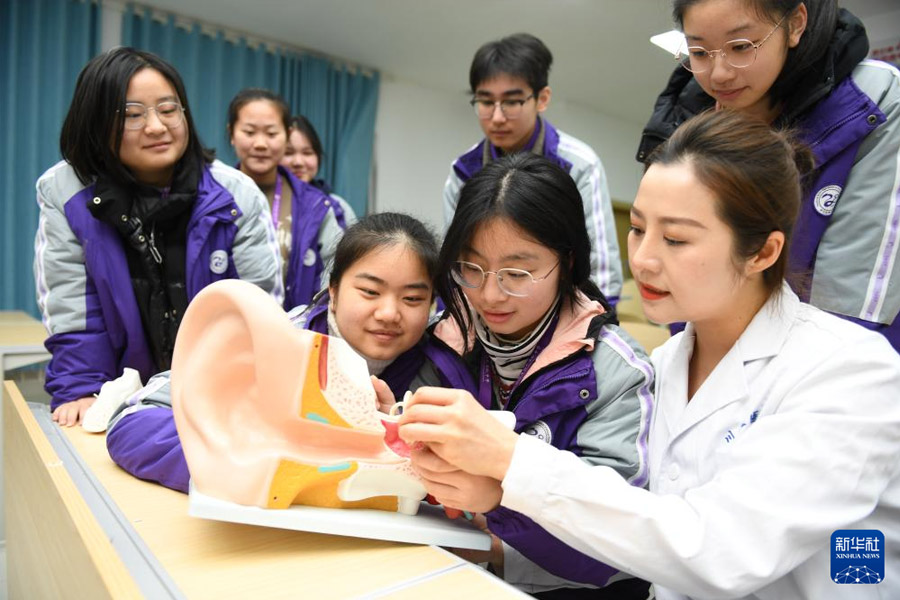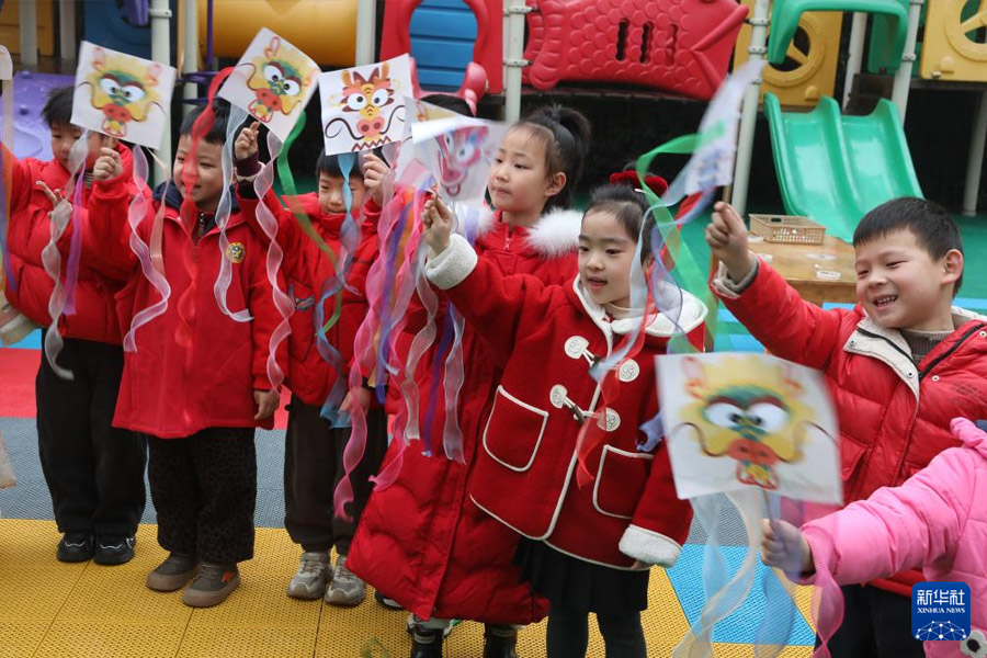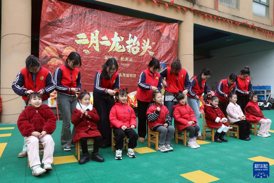 2月27日,江蘇省宜興市均陶幼兒園的老師為孩子們“梳龍頭”“扎龍辮”。(新華社發 丁煥新/攝)