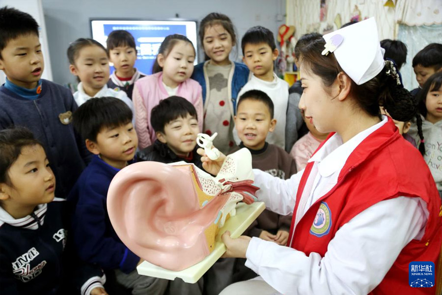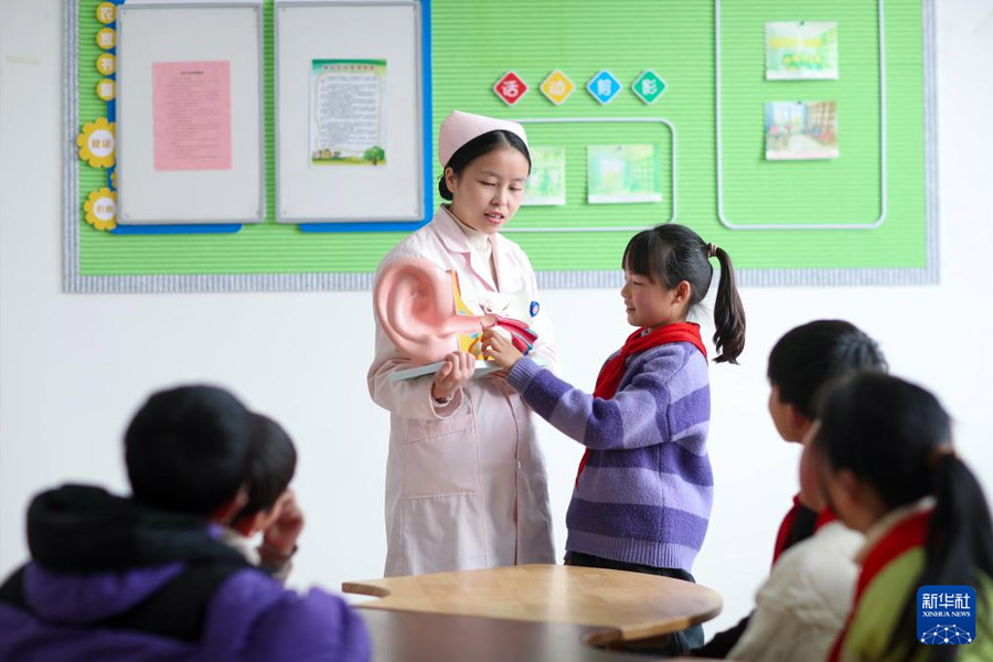 3月2日,醫務人員在江蘇省興化市昌榮鎮陳唐村新時代文明實踐站給學生講解耳朵的構造及護耳知識。(新華社發 周社根/攝)