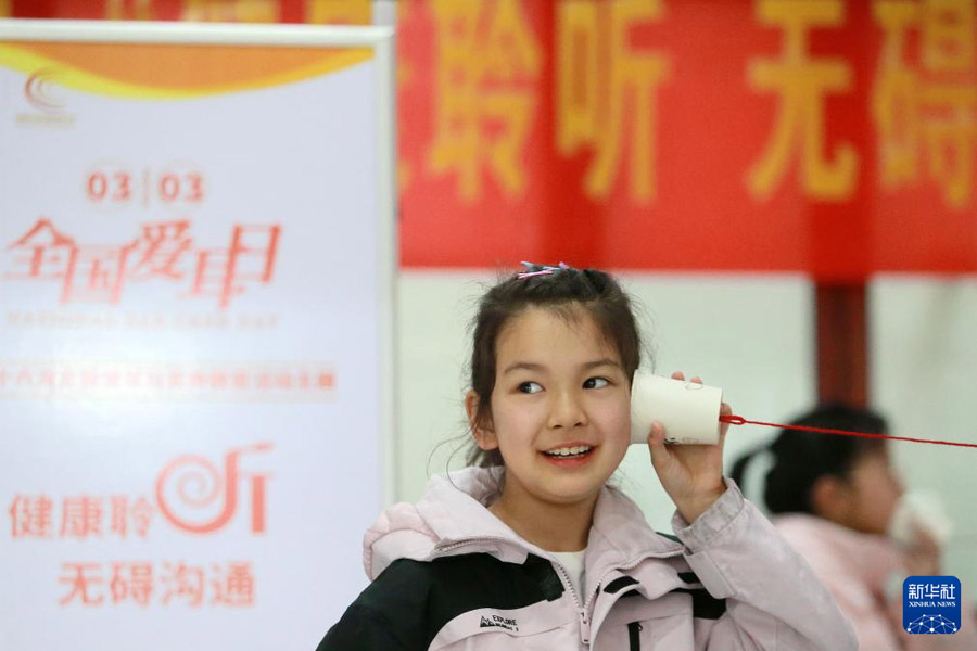 3月2日,在江蘇省揚州市徐凝門街社區,一名小朋友在感受音量對聽力產生的影響。(新華社發 孟德龍/攝)