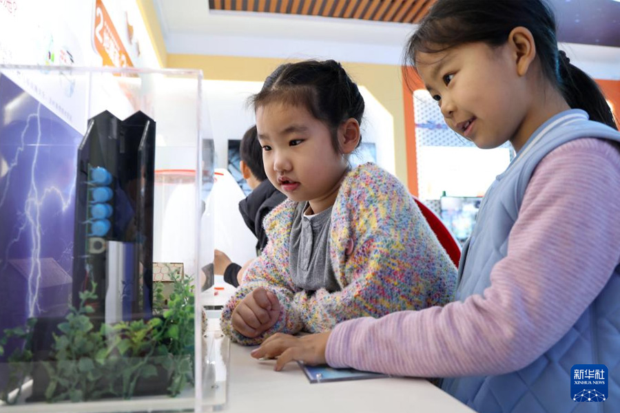 3月23日,在山東省濱州市濱城區市中街道新苑社區科普教育基地,孩子們體驗仿真雷電演示裝置。(新華社發 初寶瑞/攝)