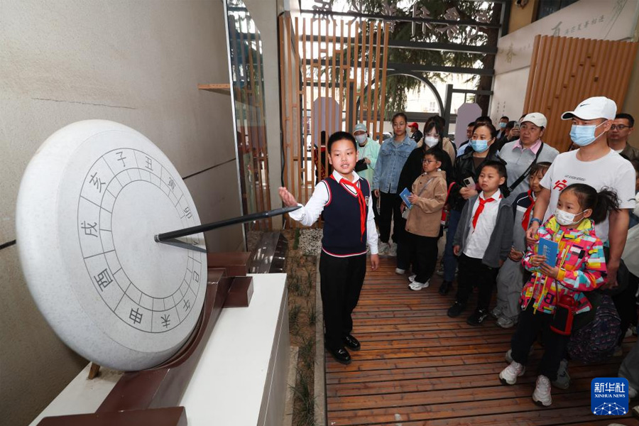 3月23日,在石家莊市氣象局市民開放日活動中,“氣象小講解員”為觀眾講解日晷用途。(新華社發 梁子棟/攝)