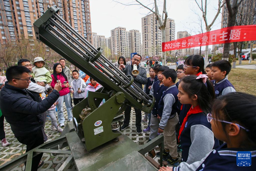 3月23日,工作人員在浙江省金華市氣象局觀測場給孩子們介紹觀測儀器用途。當日是世界氣象日,今年的主題為“攜手縮小早期預警差距”。各地組織開展豐富多彩的氣象科普活動,普及氣象知識,增強人們對氣象的關注和了解。(新華社發 時寬兵/攝)