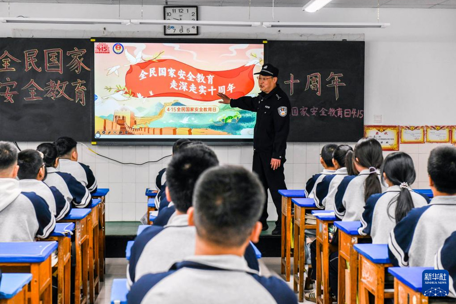 4月14日,在山東省臨沂市沂南縣銅井鎮初級中學,沂南縣公安局民警為學生講解國家安全知識。(新華社發 王彥冰/攝)