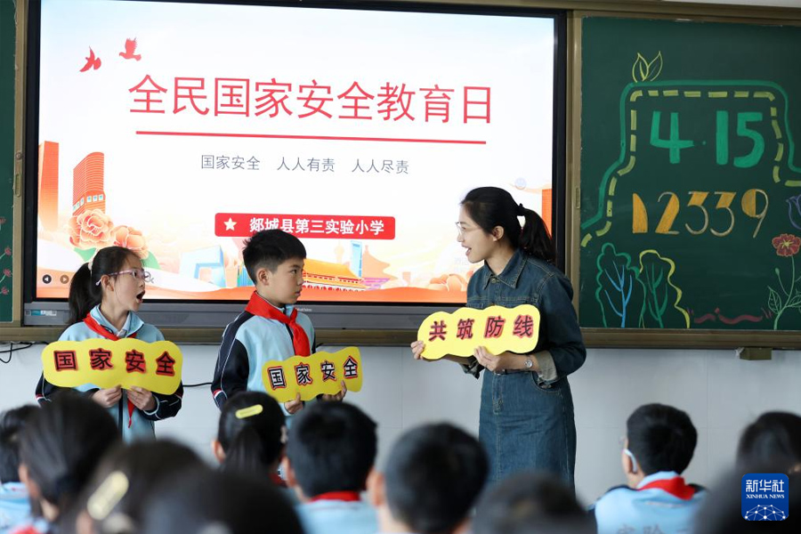4月14日,山東省臨沂市郯城縣第三實驗小學老師為學生講解國家安全知識。(新華社發 張春雷/攝)
