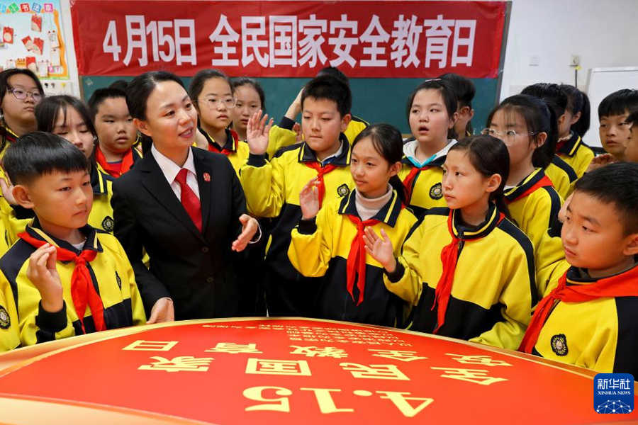 4月14日,山東省棗莊市市中區人民法院法官在東湖小學宣傳國家安全相關法律法規。(新華社發 孫中喆/攝)