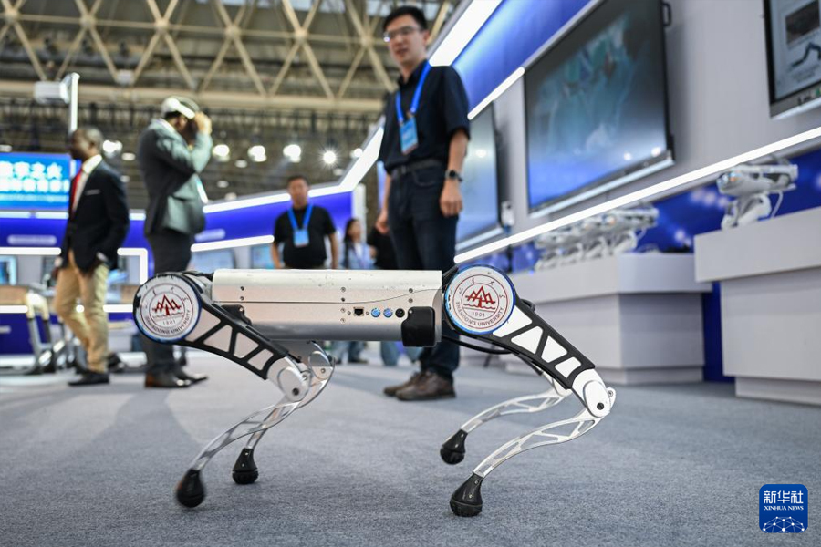 5月14日,參觀者在2025世界數字教育大會教育數字化成果展上參觀機器狗。(新華社記者 杜子璇/攝)
