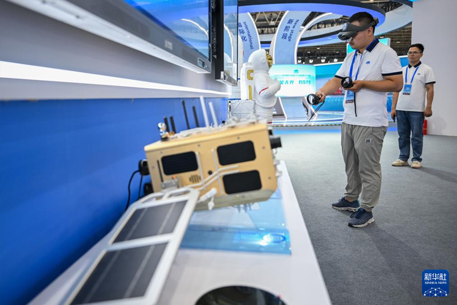 5月14日,在2025世界數字教育大會教育數字化成果展上,參觀者體驗衛星仿真教學系統。(新華社記者 杜子璇/攝)