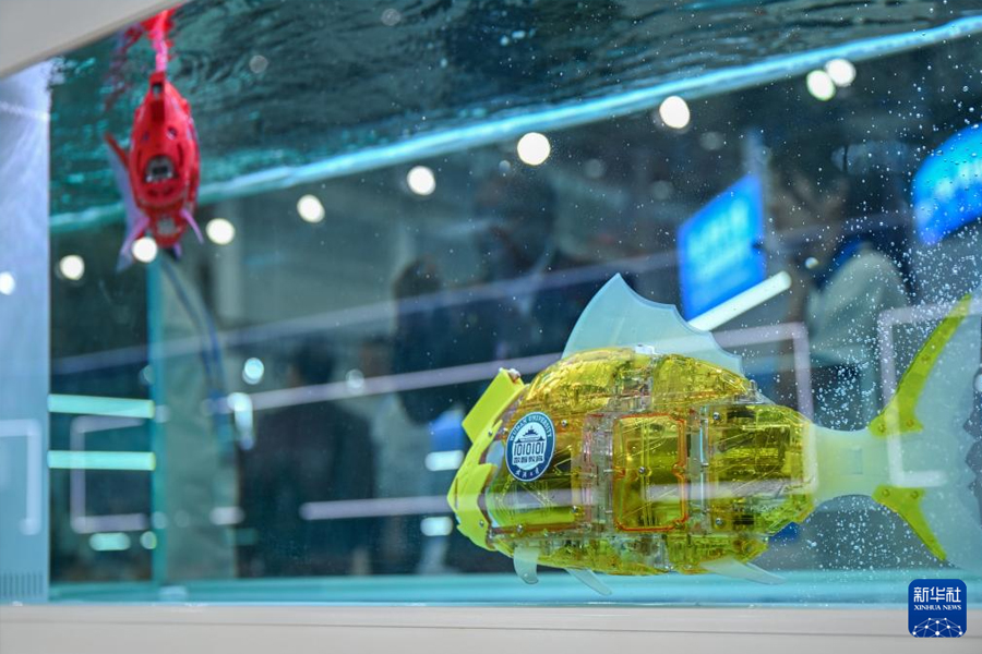 5月14日,參觀者在2025世界數字教育大會教育數字化成果展上參觀智能仿生魚。(新華社記者 杜子璇/攝)