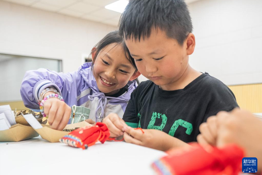 5月27日,貴州省畢節市七星關區甘河街道中心校的孩子們在老師指導下制作香囊。(新華社發 羅大富/攝)