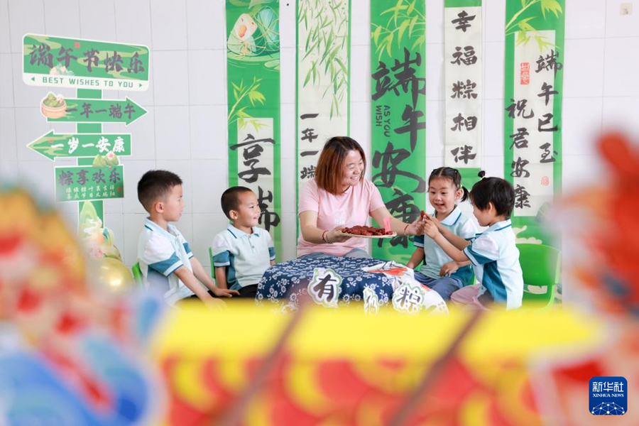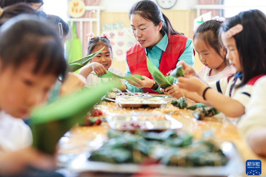 5月28日,在山東省榮成市第二實驗幼兒園,志愿者與孩子們一起制作粽子。(新華社發 李信君/攝)