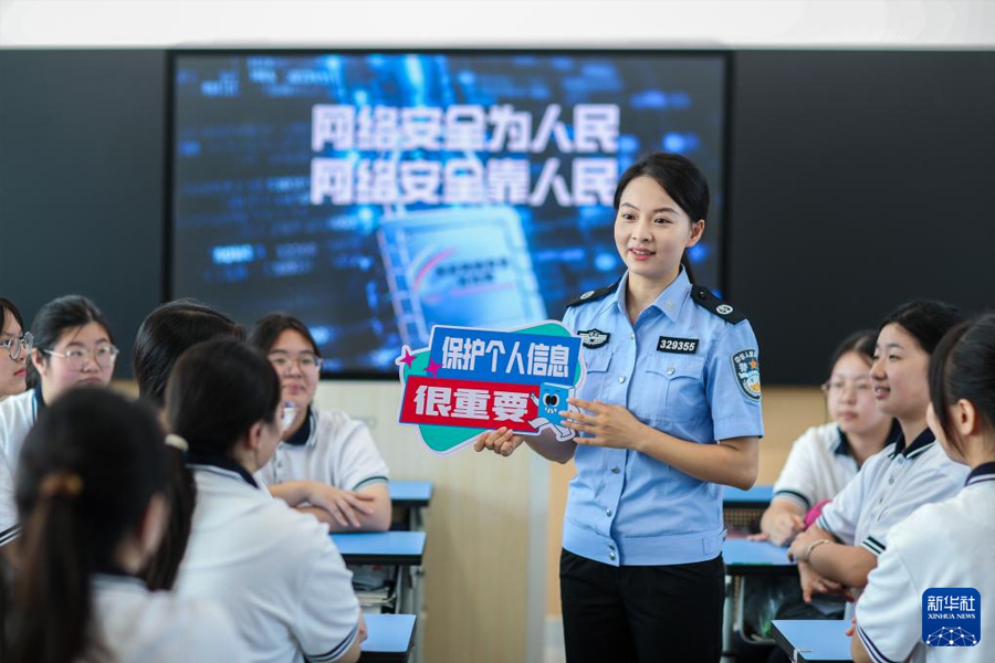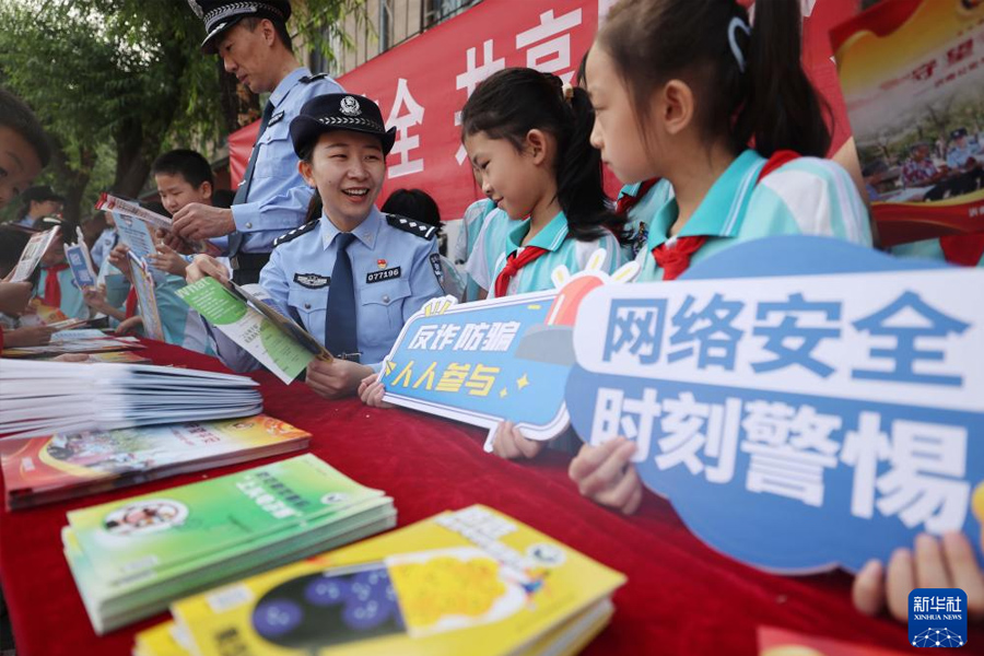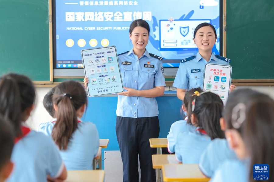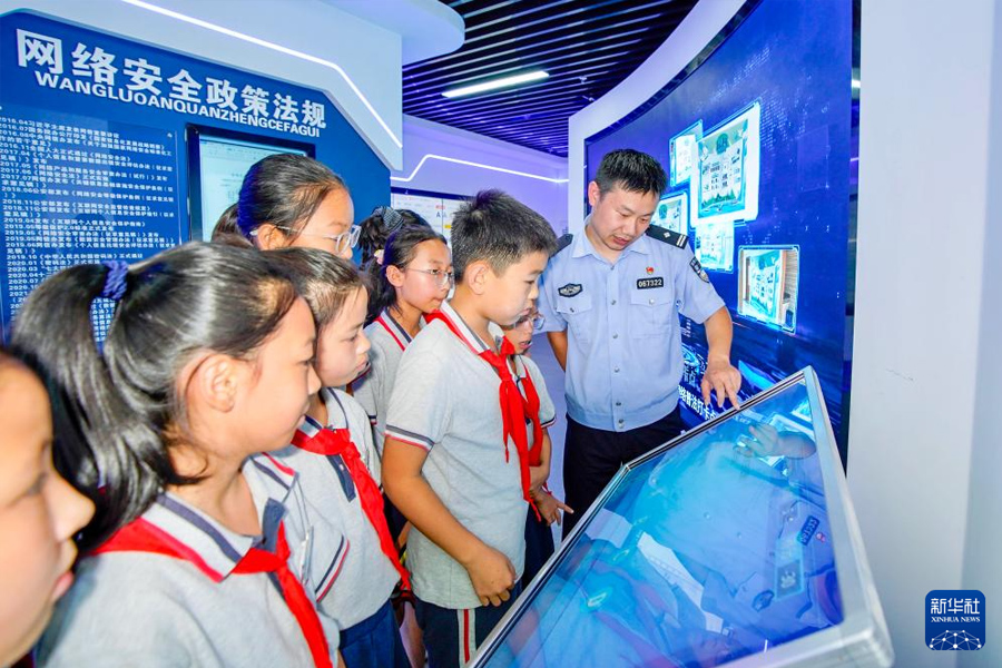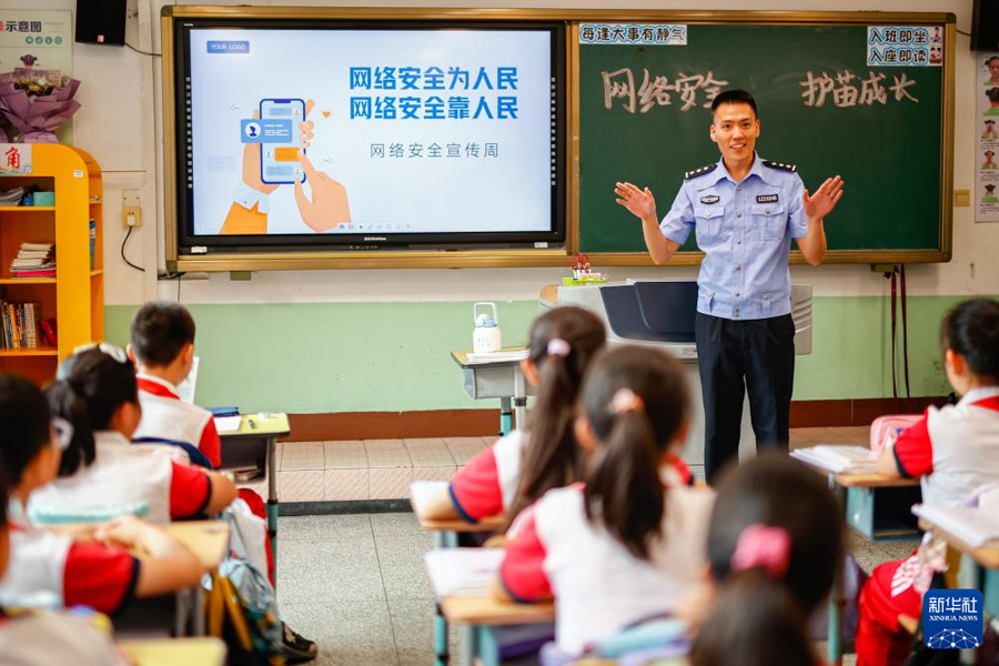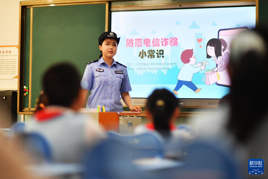 9月15日,在山東省青島市市北區延安二路小學開展的網絡安全教育主題活動上,民警為學生們講解防范電信詐騙小常識。9月15日至21日,以“網絡安全為人民,網絡安全靠人民——以高水平安全守護高質量發展”為主題的國家網絡安全宣傳周在全國范圍內開展。(新華社發 王海濱/攝)