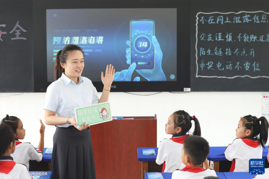 9月15日,河北省唐山市豐潤區泉河頭小學老師在給學生講解網絡安全知識。(新華社發 朱大勇/攝)