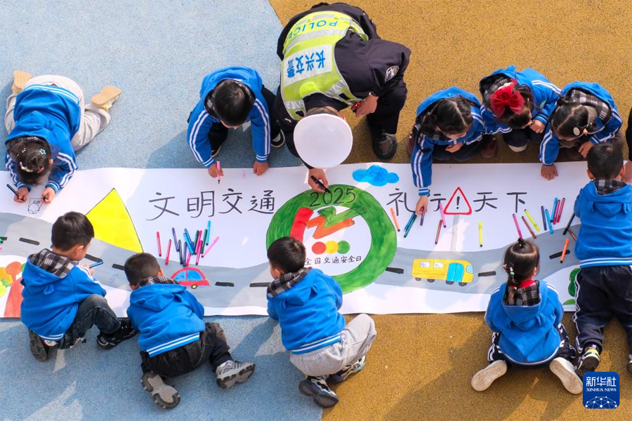 12月1日,浙江省湖州市長興縣水口鄉中心幼兒園,長興縣公安局水口派出所交警中隊工作人員與小朋友一起繪制交通安全主題畫卷。(新華社發 譚云俸/攝)