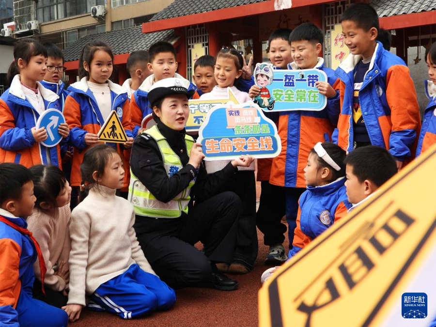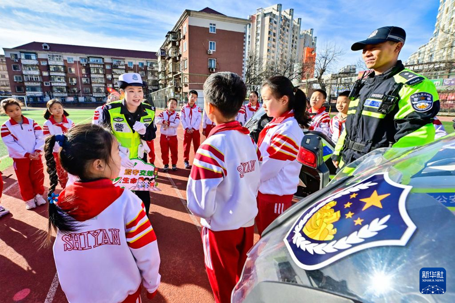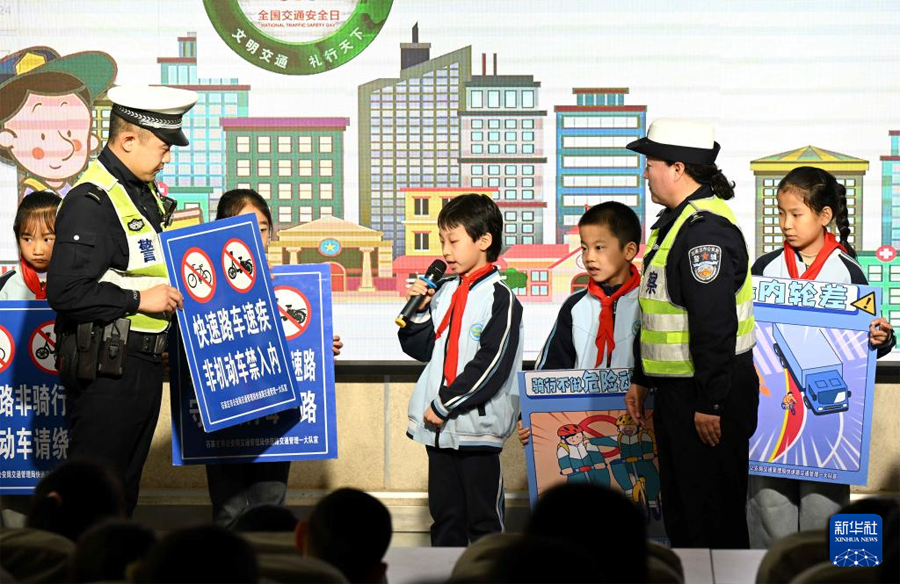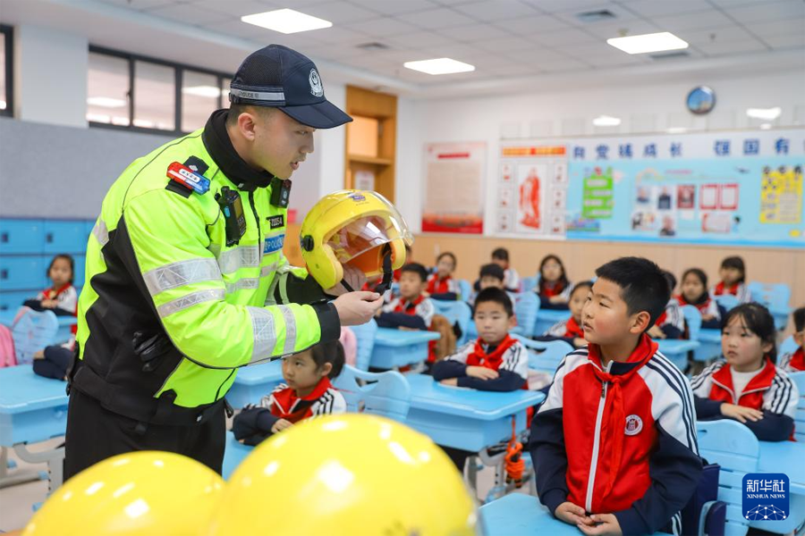 12月1日,在河北省石家莊市自強小學,民警給小朋友普及交通知識。(新華社發 陳其保/攝)
